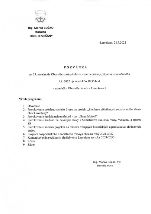Pozvánka na 25. zasadnutie Obecného zastupiteľstva obce Lemešany, ktoré sa uskutoční dňa 1.8. 2022 - pondelok - o 18:30 hod. v zasadačke Obecného úradu v Lemešanoch.