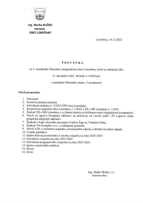 Pozvánka 2. na zasadnutie Obecného zastupiteľstva obce Lemešany