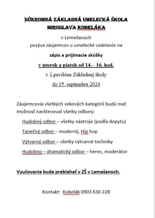 Súkromná ZUŠ Miroslava Kobeláka ponúka kvalitné umelecké vzdelávanie pre deti v hudobnom, výtvarnom a tanečnom odbore. Prihlášky je možné podávať do 15. septembra 2025.